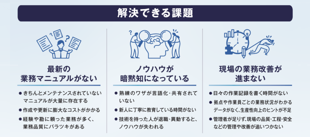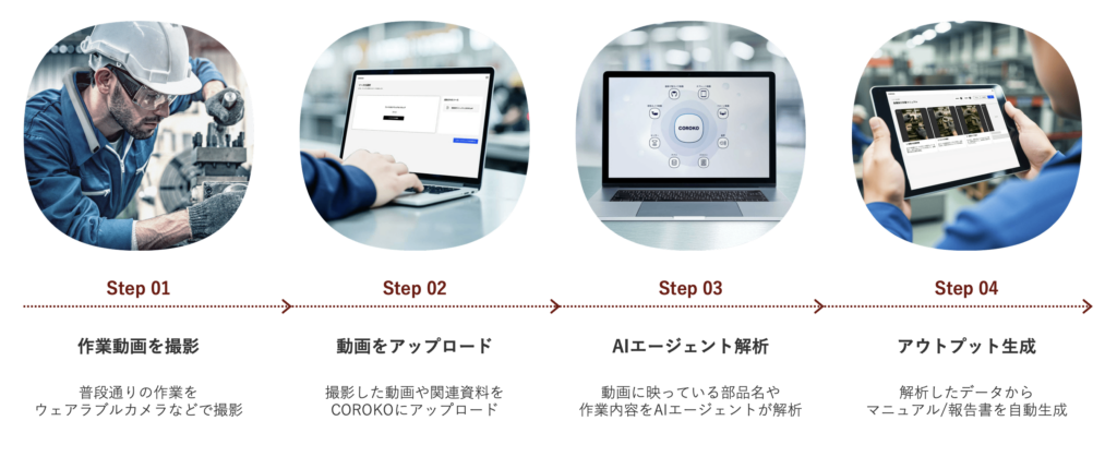 企業は実際の現場での作業状況を動画として記録するだけで、AIエージェントが動画内の作業の文脈を総合的に理解し、マニュアル/作業報告書を生成します。