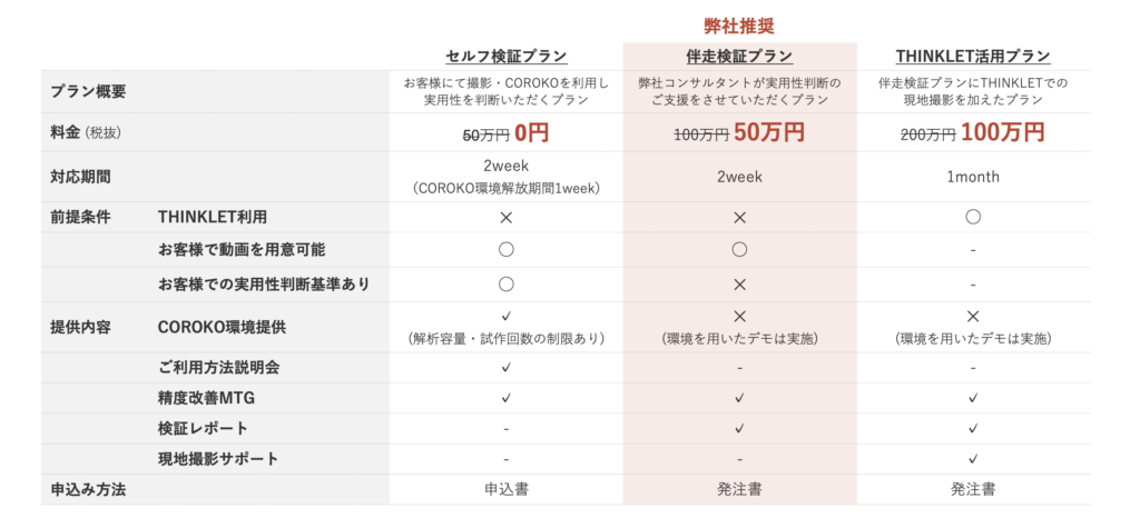 ① セルフ検証プラン:企業がCOROKOを自ら操作し、実用性を判断するプラン